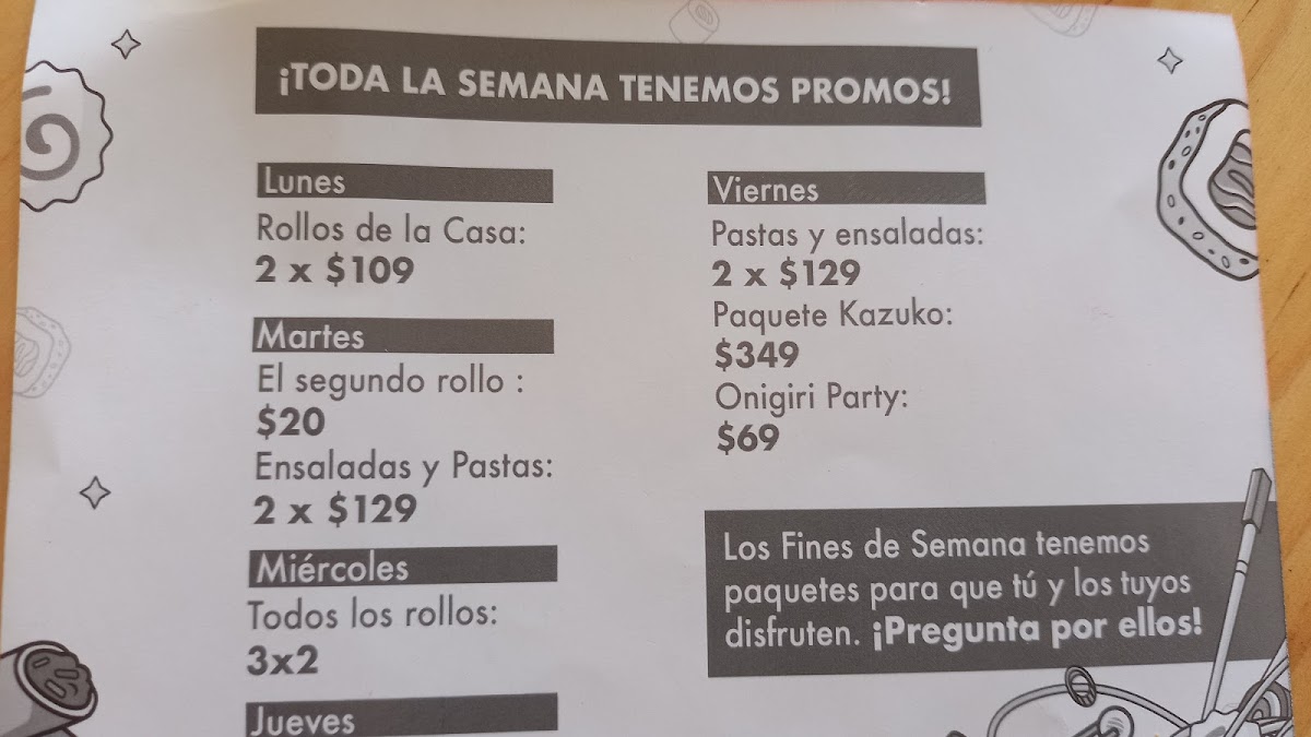 “ I highly recommend it for its good flavor and very good quality/price ratio. It is a very good place if you are someone who is just going to try sushi or if you are not too much of a seafood fan, since they have sushi of other things like chicken and they also have more things like boneles. But of course, if you are someone who is already a fan of sushi, this place also offers good, more eccentric rolls. ”
